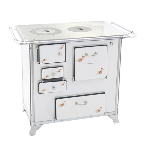 Fogão a lenha com corpo e forno em aço carbono esmaltado a fogo na cor branca com estampa florida. Pés em ferro fundido com pintura em alumínio. Cantoneiras em aço inox e guarnições em ferro fundido cromado. Chapa em ferro fundido com super polimento. Saída da chaminé direita com 11cm de diâmetro. Compartimento inferior para armazenar lenha.Tipo