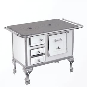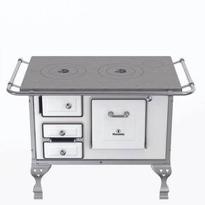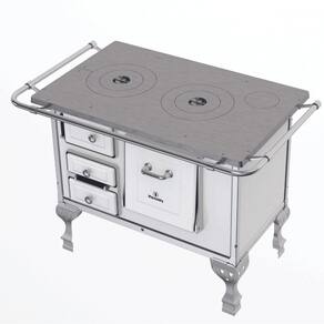 Fogão a lenha com chapa fundida e polida, frente e laterais esmaltadas, gaveta para cinzas, forno esmaltado com espelho em aço inoxidável, quadros em alumínio e guarnições em aço esmaltado, puxadores e cantoneiras em aço inox.Tipo