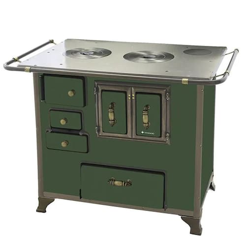 O Fogão a Lenha Barroco Número 03 de Gabinete conta com corpo e forno totalmente em aço carbono com acabamento esmaltado a fogo na pintura Verde. Seus pés são em ferro fundido com acabamento em ouro envelhecido no modelo rústico, conta também com varões em tudo de aço e guarnições em ferro fundido também com acabamento em ouro envelhecido garantindo qualidade exclusiva e um ótimo acabamento no seu Fogão a Lenha.