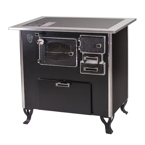 Fogão a lenha número 2 com forninho e caixa de lenha. Possui chapa de vitro cerâmica, forno em aço inox e acabamento em tinta de alta temperatura. Ideal para cozinhas e salas de festas.Tipo