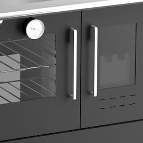 Chapa de alumínio, forno, grade do queimador em ferro fundido, varão de proteção em inox, interior do forninho e grade em inox 430, visor do forninho em vidro temperado, termômetro para conferir a temperatura do forninho, mexedor de brasa, pés com regulagem de altura, porta do queimador com visor em vidroTipo