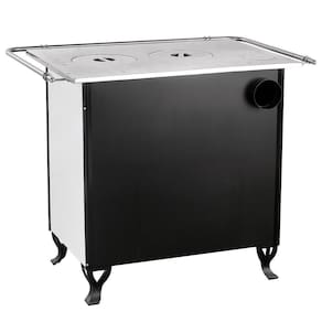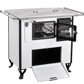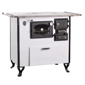 Fogão a lenha branco com forno e caixa de lenha, chapa de ferro fundido polido, forno em aço inox, termômetro e isolamento térmico.Tipo