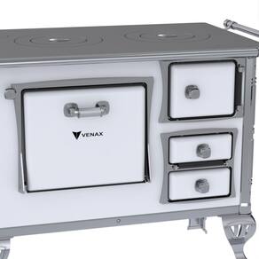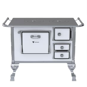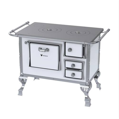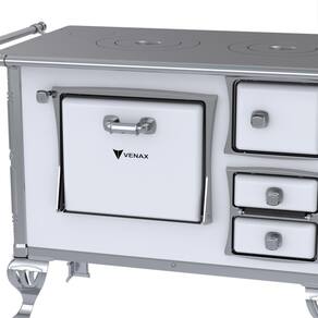 Fogão a lenha tradicional com chapa de ferro fundido polida, varão de proteção cromado, corpo em chapa QCV esmaltada, cantoneiras e suporte dos varões em inox, guarnições das portas e pés em alumínio polido, forno esmaltado e puxadores em zamac.Tipo