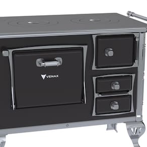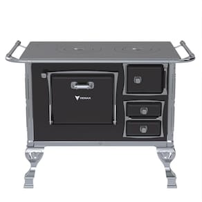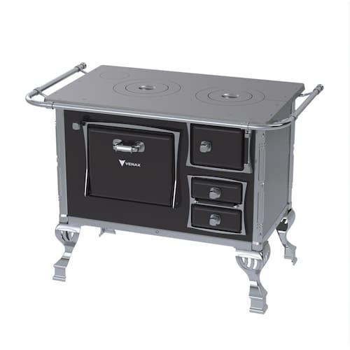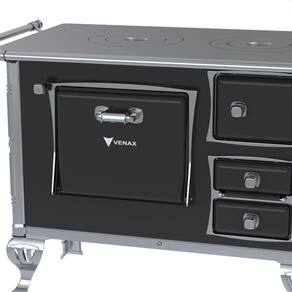 Fogão a lenha tradicional com chapa de ferro fundido polida, varão de proteção cromado, corpo em chapa esmaltada, forno esmaltado e pés cromados. Acompanha pá e gancho para manuseio.Tipo