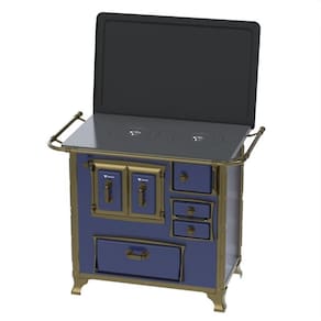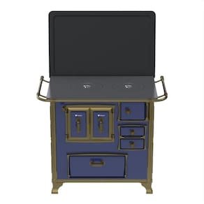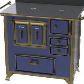 Fogão a lenha de piso com chapa de ferro fundido polido, varão e suporte de proteção com acabamento em ouro envelhecido, fornalha com tijolos pré-moldados, forno, estufa e acessórios inclusos.Tipo