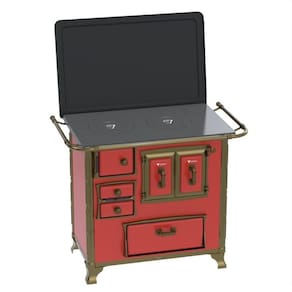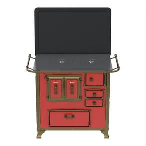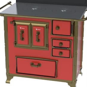Fogão a lenha com chapa de ferro fundido polido, varão de proteção em ouro envelhecido, forno esmaltado com prateleira regulável e estufa com porta em aço esmaltado.Tipo