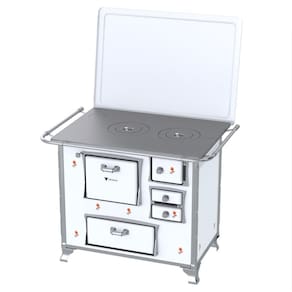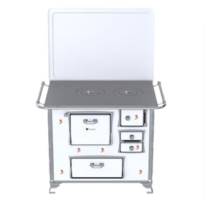 Características: Fogão a Lenha N 2 Gabinete, Chapa de Ferro Fundido Polida, Tampa com Pintura Epoxi, Varão de Proteção Cromado, Puxadores em Zamak, Suportes de Varões em Inox, Fornalhas de Tijolos, Grande do Fogo em Ferro Fundido, Cantoneiras em Inox, Com Estufa, Guarnições das Portas e Pés em Alumínio Polido, Corpo e Forno Esmaltado.
