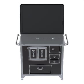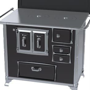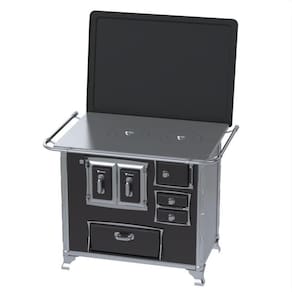 Fogão a lenha com chapa de ferro fundido polido, forno esmaltado com prateleira regulável, estufa e acessórios para manuseio.Tipo