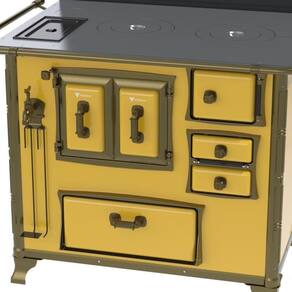 Tipo: Fogão a Lenha Chapa: Ferro Fundido Polido Varão de proteção: Tubo de Aço com Acabamento em Ouro Envelhecido* Suporte Varão de proteção: Modelo Séc. XVIII com Acabamento em Ouro Envelhecido* Caldeira: Sim Fornalha: Tijolos Pré-Moldados Porta da Fornalha: Aço Esmaltado Tranca na Porta da Fornalha: Não Porta de Ar: Aço Esmaltado Gaveta de Cinzas: Sim Porta de Gaveta de Cinzas: Aço Esmaltado Forno: Sim Porta do Forno: Aço Esmaltado com Moldura em Alumínio e Acabamento Ouro Envelhecido* Prateleira do Forno: 1 Regulável Estufa: Sim Porta da Estufa: Aço Esmaltado Base Armazenamento de Lenha: Não Cantoneiras: Ouro Envelhecido* Guarnições da Porta: Design Séc. XVIII, Acabamento Ouro Envelhecido* Puxadores: Design Séc. XVIII, Acabamento Ouro Envelhecido* Tampa: Sim Pés: Ouro Envelhecido* Acessórios: Pá e Gancho para Manuseio do Produto Saída da Chaminé: Saida a Direita ou Saída a Esquerda, na chapa e Costas(visto de frente) (selecione na hora da compra) Revestimento Corpo do Produto: Esmalte Serigrafia: Não Serpentina: Não Marca: Venax