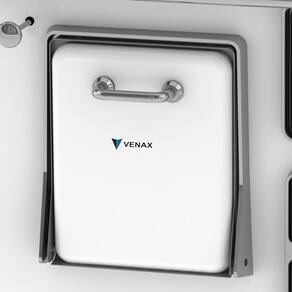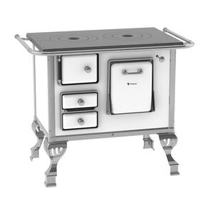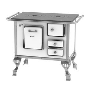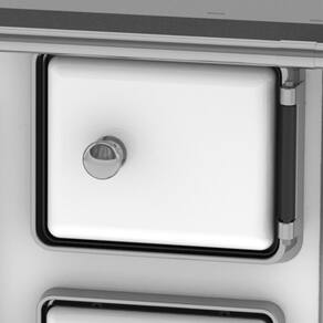 Fogão a lenha com chapa de ferro fundido polido, varão de proteção em tubo de aço cromado, porta da fornalha em aço esmaltado, forno com prateleira regulável e revestimento em esmalte.Tipo