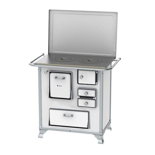 Fogão a lenha com chapa de ferro fundido polido, varão de proteção em tubo de aço cromado, forno com prateleira regulável, estufa e tampa. Acompanha pá e gancho para manuseio.Tipo