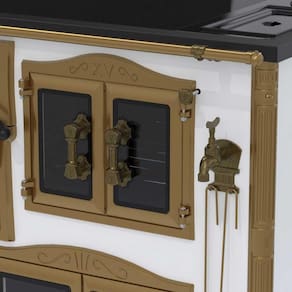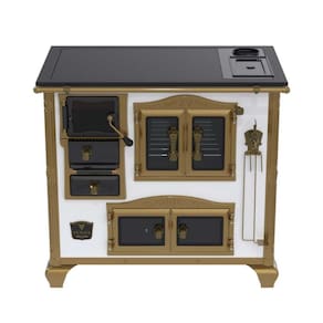 - Tipo: Fogão a Lenha; - Chapa: Vidro Vitrocerâmico com Moldura Pintada; - Varão de proteção: Tubo de Aço com Acabamento em Tom Ouro Velho; - Suporte Varão de proteção: Modelo Séc. XV Acabamento em Tom Ouro Velho; - Caldeira: Sim; - Fornalha: Tijolos Pré-Moldados; - Porta da Fornalha: Vidro Vitrocerâmico com Moldura em Ferro Fundido Pintado; - Tranca na Porta da Fornalha: Sim; - Porta de Ar: Ferro Fundido Pintado; - Gaveta de Cinzas: Sim; - Porta da Gaveta de Cinzas: Ferro Fundido Pintado; - Forno: Sim; - Porta do Forno: Dupla com Vidro Vitrocerâmico e Moldura com Acabamento em Tom Ouro Velho; - Prateleira do Forno: 1 Regulável; - Estufa:Sim; - Porta da Estufa: Dupla com Vidro Vitrocerâmico e Moldura com Acabamento em Tom Ouro Velho; - Base Armazenamento de Lenha: Não; - Cantoneiras: Aço Estilo Sec. XV com Acabamento em Tom Ouro Velho; - Guarnições da Porta: Design Séc. XV Acabamento em Tom Ouro Velho; - Puxadores: Design Séc. XV Acabamento em Tom Ouro Velho; - Tampa: Não; - Pés: Design Séc. XV Acabamento em Tom Ouro Velho; - Acessórios: Pá e Gancho para Manuseio; - Saída da Chaminé: Saída à direita, na Chapa (Olhando de Frente); - Revestimento Corpo do Produto: Esmalte; - Serigrafia: Não; - Serpentina: Não; - Marca: Venax; - Garantia: 1 Ano.