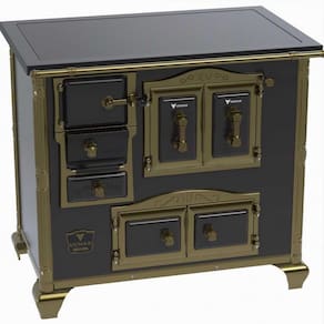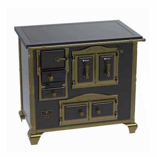 - Tipo: Fogão a Lenha; - Chapa: Vidro Vitrocerâmico com Moldura Revestida Preta; - Varão de Proteção: Tubo de Aço com Acabamento em; - Tom Ouro Velho*; - Suporte Varão de proteção: Modelo Séc. XV Acabamento Tom Ouro Velho*; - Caldeira: Não; - Fornalha: Tijolos Pré-Moldados; - Porta da Fornalha: Vidro Vitrocerâmico com moldura em Ferro Fundido Pintado; - Tranca na Porta da Fornalha: Sim; - Porta de Ar: Ferro Fundido Pintado; - Gaveta de Cinzas: Sim; - Porta da Gaveta de Cinzas: Aço Esmaltado; - Forno: Sim; - Porta do Forno dupla em Aço Esmaltado, Moldura em Ferro Fundido Acabamento Tom Ouro Velho*; - Prateleira do Forno: 1 Regulável; - Estufa: Sim; - Base Armazenamento de Lenha: Não; - Cantoneiras: Tom Ouro Velho*; - Guarniçoes da Porta: Design Acabamento Tom Ouro Velho*; - Puxadores: Design Séc. XV acabamento Tom Ouro Velho*; - Tampa: Não; - Pés: Design Séc. XV Acabamento Tom Ouro Velho*; - Acessórios: Pá e Gancho para Manuseio; - Saída da Chaminé: Saída à Direita, nas costas (Olhando de Frente); - Revestimento Corpo do Produto: Esmalte; - Serigrafia: Não; - Serpentina: Não; - Marca: Venax; - Garantia: 1 Ano.