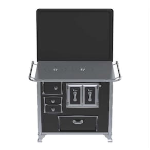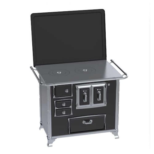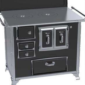 - Tipo: Fogão a Lenha; - Chapa: Ferro Fundido Polido; - Varão de proteção: Tubo de Aço Cromado; - Suporte Varão de proteção: Modelo Séc. XVIII Cromado; - Caldeira: Não; - Fornalha: Tijolos Pré-Moldados; - Porta da Fornalha: Aço Esmaltado; - Tranca na Porta da Fornalha: Não; - Porta de Ar: Aço Esmaltado; - Gaveta de Cinzas: Sim; - Porta de Gaveta de Cinzas: Aço Esmaltado; - Forno: Sim; - Porta do Forno: Dupla Esmaltada com Moldura Cromada; - Prateleira do Forno: 1 Regulável; - Estufa: Sim; - Porta da Estufa: Aço Esmaltado; - Base Armazenamento de Lenha: Não; - Cantoneiras: Inox; - Guarnições da Porta: Design Séc. XVIII Acabamento Cromado; - Puxadores: Design Séc. XVIII Acabamento Cromado; - Gabinete: Sim; - Tampa: Sim; - Pés: Cromados; - Acessórios: Pá e Gancho para Manuseio - Saída da Chaminé: Saída a Direita, na chapa e Costas (visto de Frente); - Revestimento Corpo do Produto: Esmalte; - Serigrafia: Não; - Serpentina: Não; - Marca: Venax.