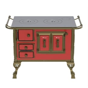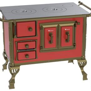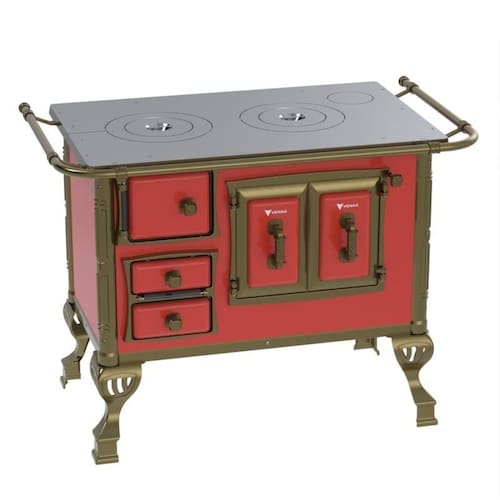 Fogão a lenha colonial vermelho sem tampa, chapa de ferro fundido polido, varão de proteção em tubo de aço com acabamento em ouro envelhecido, fornalha com tijolos pré-moldados, forno com volume de 28L e porta em aço esmaltado com moldura em alumínio.Tipo