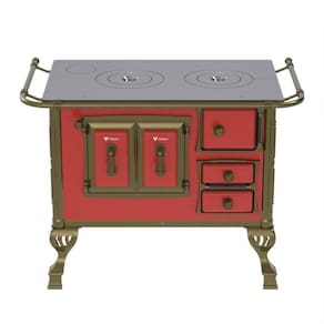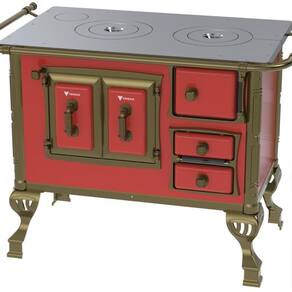 Fogão a lenha colonial vermelho sem tampa, chapa de ferro fundido polido, varão de proteção em tubo de aço com acabamento em ouro envelhecido, fornalha com tijolos pré-moldados, forno com volume de 28L e porta em aço esmaltado com moldura em alumínio.Tipo