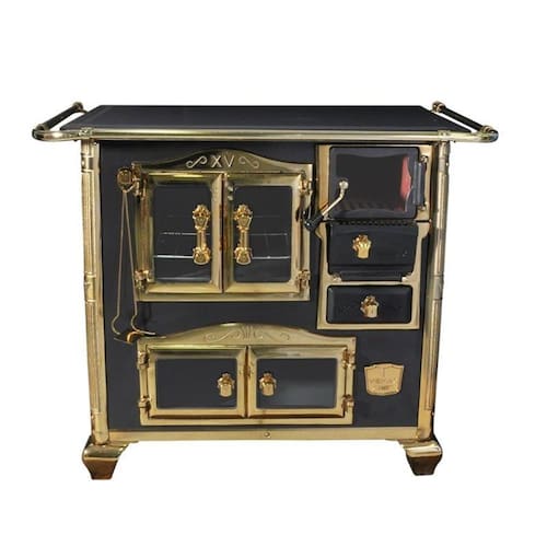 Fogão a lenha com chapa de ferro fundido polido, varão de proteção em tubo de aço com acabamento em Yellow Gold, porta da fornalha com vidro vitrocerâmico, forno com prateleira regulável e estufa. Design Séc. XV com acabamento em Yellow Gold.Tipo