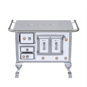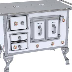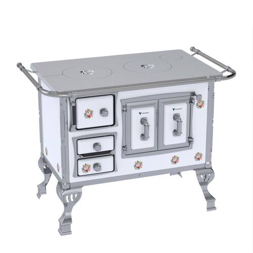 Fogão a lenha N1 Séc.XVIII com chapa de alumínio polida, varão de proteção cromado, corpo em chapa QCV esmaltada, cantoneiras em inox, porta dupla no forno, forno esmaltado, puxadores em zamak.Tipo