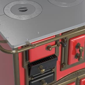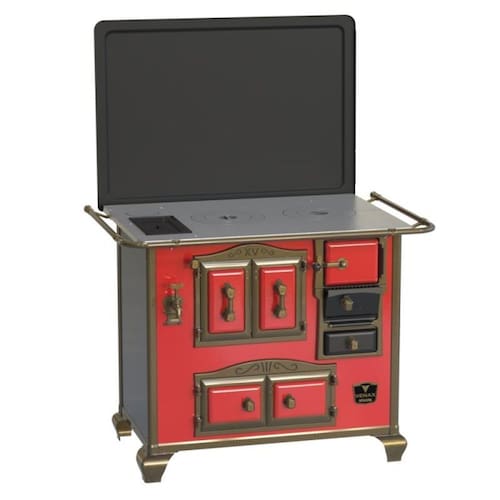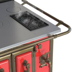 Fogão a lenha com chapa de ferro fundido polido, varão de proteção com acabamento em ouro envelhecido, forno com volume de 32L, estufa com volume de 85L e caldeira com volume de 4L.Tipo