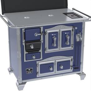 Fogão a lenha com chapa de alumínio polida, forno e estufa, design do século XVIII com acabamento cromado.Tipo