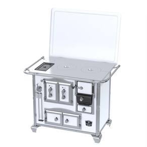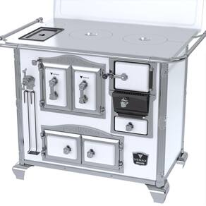 Fogão a lenha com chapa de ferro alumínio polida, caldeira de alumínio teflonada, corpo em chapa QCV esmaltada, porta dupla no forno e estufa, e estufa.Tipo