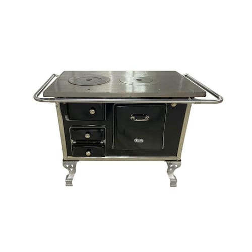 Chapa de ferro fundido polido Fornalha com grelha de ferro fundido revestida com tijolos Forno com parte interna em aço galvanizado (não é esmaltado/pintado) Frente e laterais esmaltadas Gaveta para cinzas Puxadores cromados Entrada regulável de ar Pés em Alumínio Escoras, cantoneiras em aço inox
