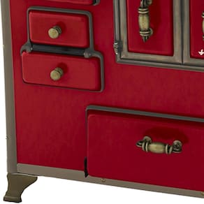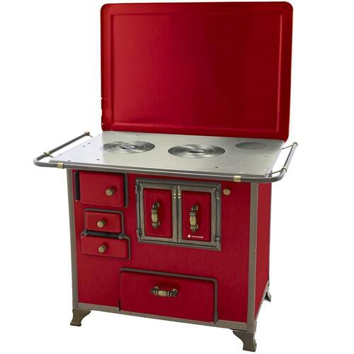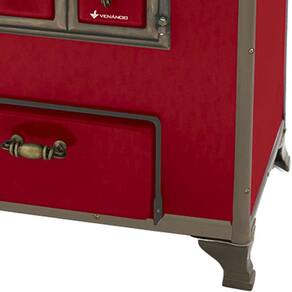 Chapa em ferro fundido com super polimento e maior dimensão; Pés em ferro fundido modelo rústico com acabamento em ouro envelhecido; Corpo e forno do fogão totalmente em aço carbono com acabamento esmaltado; Puxador e escoras do varão em Zamak com acabamento em ouro envelhecido; Varões em tubo de aço com acabamento em ouro envelhecido; Guarnições em ferro fundido com acabamento em ouro envelhecido; Modelo acompanha tampa; Forno com sistema de abertura de porta dupla; Modelo com conceito de antiguidade; Possui compartimento inferior para armazenagem da lenha, mantendo-a seca.Tipo