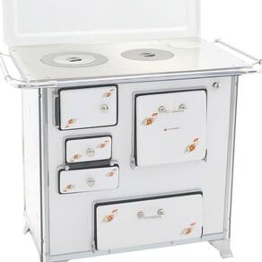 O Fogão a Lenha Número 02 Gabinete modelo Tradicional conta com corpo e forno totalmente em aço carbono com acabamento esmaltado a fogo na pintura Branca com Estampa Florida. Seus pés são em ferro fundido com pintura em alumínio, contando também com cantoneiras em aço inox e guarnições em ferro fundido cromado garantindo qualidade exclusiva e um ótimo acabamento no seu Fogão a Lenha.