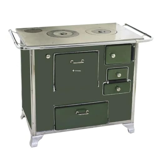 O Fogão a Lenha Número 02 Gabinete Modelo Tradicional conta com corpo e forno totalmente em aço carbono com acabamento esmaltado a fogo na pintura Verde. Seus pés são em ferro fundido com pintura em alumínio, contando também com cantoneiras em aço inox e guarnições em ferro fundido cromado garantindo qualidade exclusiva e um ótimo acabamento no seu Fogão a Lenha.