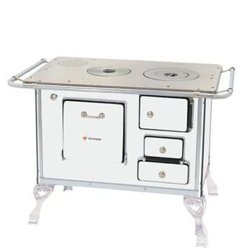 Fogão a lenha com corpo e forno em aço carbono esmaltado a fogo na cor branca. Pés em ferro fundido com pintura em alumínio. Cantoneiras em aço inox e guarnições em ferro fundido cromado. Puxador e escoras do varão em zamak com acabamento cromado. Saída da chaminé esquerda.Tipo