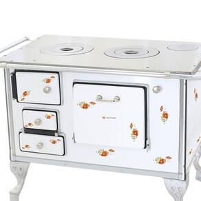O Fogão a Lenha 02 conta com corpo e forno totalmente em aço carbono com acabamento esmaltado a fogo na pintura Branca. Seus pés são em ferro fundido com pintura em alumínio, contando também com cantoneiras em aço inox e guarnições em ferro fundido cromado garantindo qualidade exclusiva e um ótimo acabamento no seu Fogão a Lenha com estampa florida.