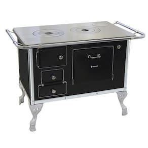 O Fogão a Lenha 02 conta com corpo e forno totalmente em aço carbono com acabamento esmaltado a fogo na pintura Preta. Seus pés são em ferro fundido com pintura em alumínio, contando também com cantoneiras em aço inox e guarnições em ferro fundido cromado garantindo qualidade exclusiva e um ótimo acabamento no seu Fogão a Lenha.
