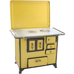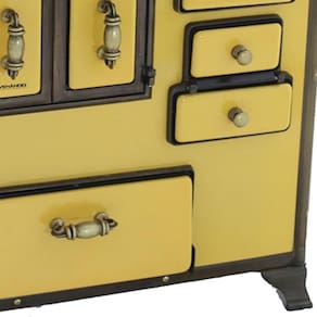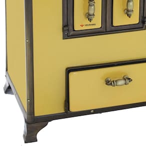 Chapa em ferro fundido com super polimento e maior dimensão; Pés em ferro fundido modelo rústico com acabamento em ouro envelhecido; Corpo e forno do fogão totalmente em aço carbono com acabamento esmaltado; Puxador e escoras do varão em Zamak com acabamento em ouro envelhecido; Varões em tubo de aço com acabamento em ouro envelhecido; Guarnições em ferro fundido com acabamento em ouro envelhecido; Modelo acompanha tampa; Forno com sistema de abertura de porta dupla; Modelo com conceito de antiguidade; Possui compartimento inferior para armazenagem da lenha, mantendo-a seca.Tipo