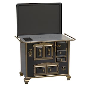 Fogão à lenha Venax N2 Gabinete Imperador Premium com chapa de Vidro Vitrocerâmico, moldura preta, suporte de proteção, fornalha com tijolos pré-moldados, porta do forno dupla com vidro Vitrocerâmico e moldura em Ouro Envelhecido, puxadores com design do Séc. XV e acabamento em Ouro envelhecido.Tipo