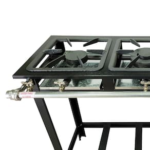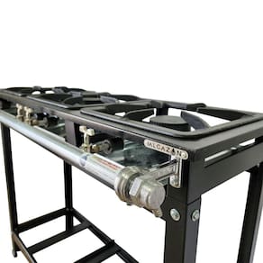 Ele conta com três grelhas de ferro fundido de 30x30 cm, dois queimadores simples de 11cm cada e um queimador duplo de 15,5cm. O queimador duplo, com duas chamas na mesma boca, permite um aquecimento mais eficiente e uniforme dos alimentos, garantindo um cozimento perfeito. O fogão também possui um registro regulador tipo torneira, que facilita o controle da intensidade da chama, permitindo ajustar a temperatura de acordo com a necessidade do preparo dos alimentos.