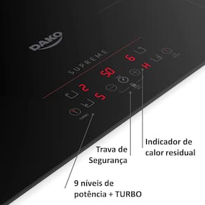 Cooktop de Indução 4 Bocas Dako Supreme: Modernidade e Segurança para sua Cozinha. Tecnologia de Indução Avançada para aquecimento rápido e eficiente. Design Sofisticado em Vidro Preto. Trava de Segurança para evitar acionamento acidental. Controle Eletrônico com Display Touch. Fácil Manutenção.Luz de calor residual
