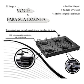 ? Potência equilibrada: 4 queimadores rápidos de aproximadamente 2000W, perfeitos para preparar várias receitas simultaneamente. 🔥 Vidro temperado 6mm: resistência e visual premium para qualquer ambiente. 👌 Trempes individuais em aço esmaltado, com ótima estabilidade para panelas. ? Compacto e funcional: ideal para espaços pequenos, trailers, motorhomes ou áreas externas. 🧼 Limpeza facilitada: superfície lisa e trempes removíveis agilizam o cuidado diário. 🔧 Funcionamento com GLP (botijão): ideal para locais sem gás encanado.