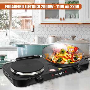 Fogão elétrico portátil com 2 bocas, potência total de 2000W, design moderno em inox, fácil limpeza e controle independente de temperatura.Luz de calor residual