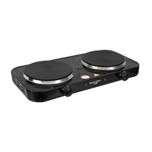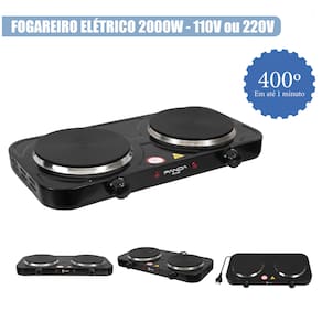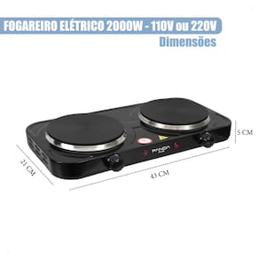 Fogão elétrico portátil com 2 bocas, potência total de 2000W, design moderno em inox, fácil limpeza e controle independente de temperatura.Luz de calor residual