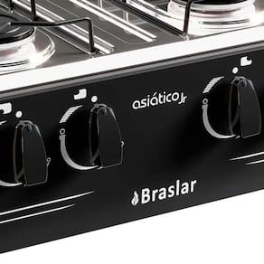 Caracteristicas: Fogao Marca: Braslar Modelo: Asiatico Junior Origem: Nacional Quantidade de bocas: 4 Bocas Acendimento: Manual Material da mesa: Aco inox Funcionamento: GLP - A conversao para GN precisa ser adaptada, conforme consta no manual do produto Potencia dos queimadores: Familia: 7,5 kW Eficiencia energetica: A Manipulos removiveis: Sim Tampa de vidro: Nao Timer: Nao Relogio: Nao Termostato: Nao