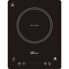 Cooktop Fischer de 1 queimador por indução, 220V, com painel touch screen, timer de até 3 horas, 10 níveis de potência e trava de segurança. Aquece por indução magnética, ideal para panelas com fundo plano de metal ferroso.Luz de calor residual