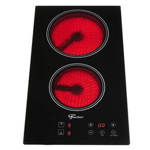 Cooktop Fischer elétrico com mesa vitrocerâmica, 2 bocas, acendimento superautomático, controle touch screen, 9 níveis de potência, timer de até 99 minutos e trava de segurança.Luz de calor residual