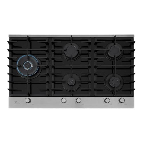 Fogão cooktop Fischer 5 bocas Platinium bivolt com acendimento superautomático, grades de ferro fundido esmaltado e mesa de vidro preto com frame de alumínio.Luz de calor residual