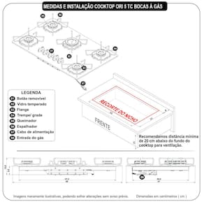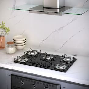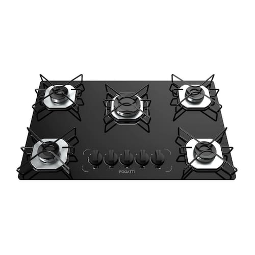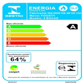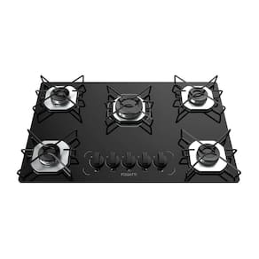 Mesa em vidro temperado preto 6 mm com flange inox, design com grafias que destacam o queimador rapido -grande- e os semi-rapidos e acendimento seletor automatico: e so pressionar, girar e cozinhar. As trempes aramadas esmaltadas possuem sistema anti-rotacao para mais seguranca e estabilidade das panelas.Luz de calor residual
