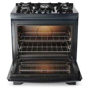 Forno de 100L com Limpa Fácil: O forno de grande capacidade possui revestimento que evita o acúmulo de gordura e duas prateleiras deslizantes, tornando o uso e a limpeza muito mais práticos.