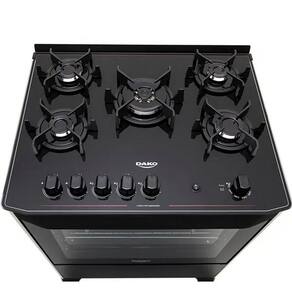 Caracteristicas: Marca: Dako Modelo: 300000728 Tipo: Fogao de piso Quantidade de bocas: 5 bocas Acendimento: Automatico Material da mesa: Vidro temperado Funcionamento: GLP - A conversao para GN precisa ser adaptada, conforme consta no manual do produto Tipo de queimadores: Tripla chama, rapido e semi-rapido Material das trempes: Ferro Fundido Manipulos removiveis: Sim Tampa de vidro: Nao Capacidade do forno: 100 litros Prateleiras do forno: 01 grade deslizante e 01 auto deslizante Luz no forno: Sim Forno autolimpante: Nao Acabamento do forno: Limpa Facil Timer: Nao Grill: Nao Relogio: Nao Termostato: Nao Bandeja coletora de residuos: Nao Forno duplo: Nao Sistema corta gas: Sim Pes: Sim Eficiencia energetica: A Potencia dos queimadores: Tripla chama: 3,3 kW | Rapido: 2,0 kW | Semi-rapido: 1,7 kW