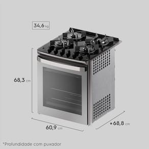 O fogão é equipado também com Grill, para você finalizar suas receitas com mais crocância e sabor. Utilize o grill para gratinar e dourar a superfície dos alimentos, resultando em mais textura em seus pratos.