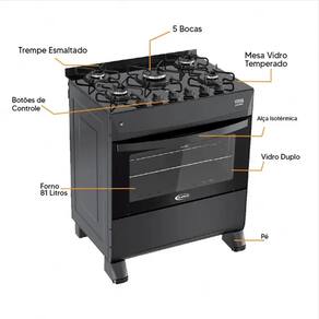 -Marca: Clarice -Quantidade de Bocas: 5 -Forno: Sim -Capacidade: 81 Litros -Porta do Forno: Vidro Duplo -Fácil Limpeza: Forno Easy Clean -Dimensões Produto (L x A x C): 73 x 90 x 62 cm -Peso Bruto: 33,8 kg