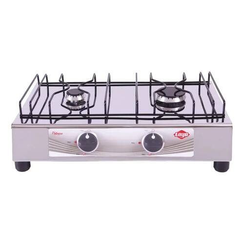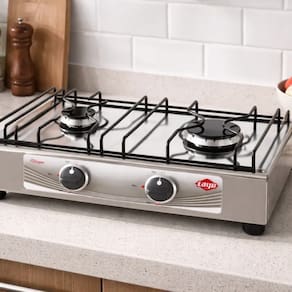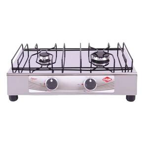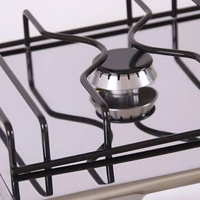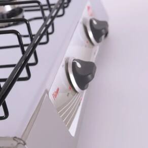 Fogão de mesa 2 bocas em aço inox. Queimadores esmaltados. Trempe esmaltada removível. Painel com indicador em braile. Manípulos de controle de gás.Luz de calor residual