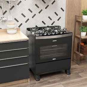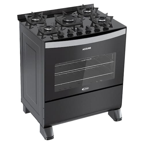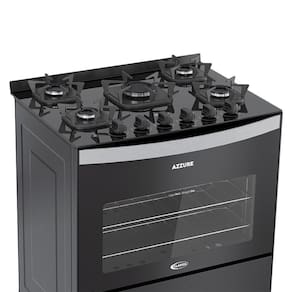 O fogao de piso AZZURE GLASS 5B e um modelo lancamento Clarice Eletrodomesticos que conta com queimadores forjados e boca central tripla chama, forno com tecnologia easy clean, luz interna, puxador em aluminio escovado e visor do forno total glass com vidro duplo, bases das trempes esmaltadas e trempes em ferro fundido, mesa em vidro temperado e com respaldo, manipulos top control sobre a mesa, com acendimento automatico.